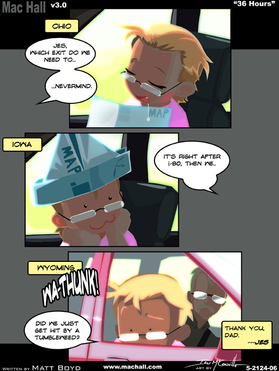{{Title: Ohio}} [[Jes asleep riding in the passenger seat of a car with a stream of drool hanging from her mouth. A road map rests across her chest.]] Jes's Dad: Jes, which exit do we need to... Jes's Dad: ...Nevermind. {{Title: Iowa}} [[Jes awake wearing the map as a folded paper hat]] Jes's Dad: It's right after I-80, Then we... {{Title: Wyoming}} [[Jes and her dad both looking out the passenger side of the car]] <<WA-THUNK!>> Jes: Did we just get hit by a tumbleweed? {{Title: Thank you dad. -Jes}}