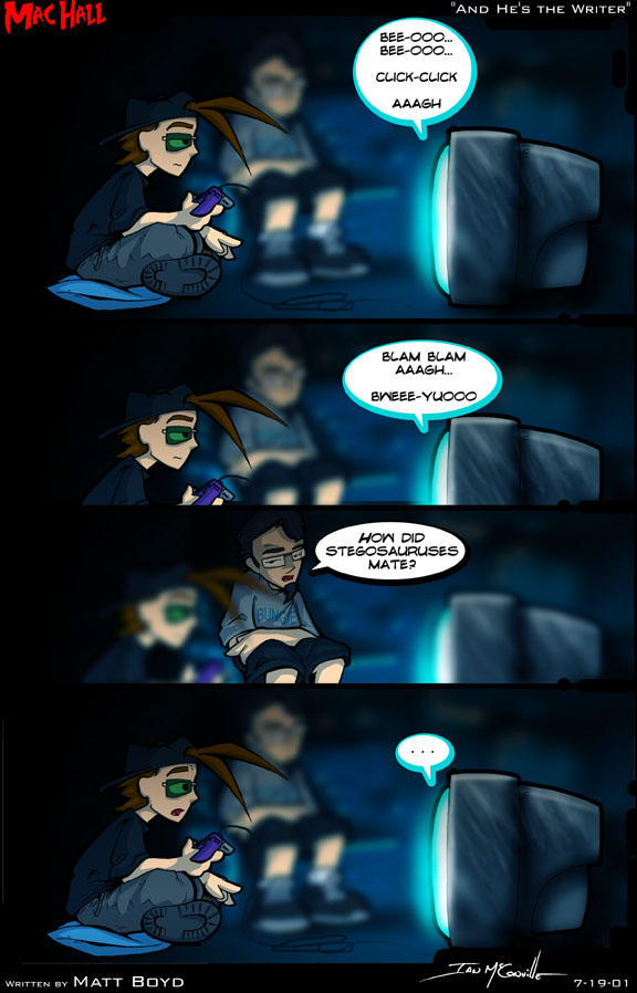 [[Ian sits on a pillow in front of a TV, eyes half-closed, console controller in hand, and no expression on his face]]