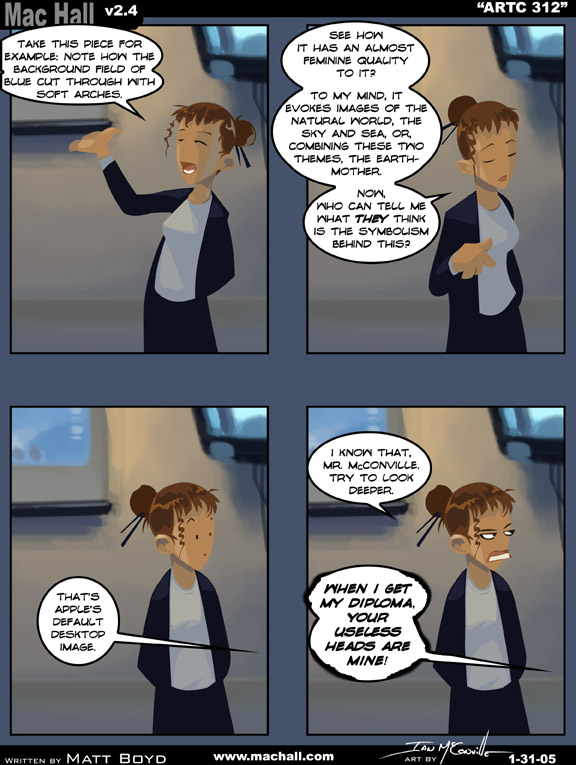Ian's art teacher: Take this piece for example: note how the background field of blue cut through with soft arches. Ian's art teacher: See how it has an almost feminine quality to it? To my mind, it evokes images of the natural world, the sky and sea, or, combining these two themes. The earth-mother. Now, who can tell me what THEY think is the symbolism behind this? Ian: That's apple's default desktop image. Ian's art teacher: I know that, Mr. McConville. Try to look deeper. Ian: WHEN I GET MY DIPLOMA, YOUR USELESS HEADS ARE MINE!