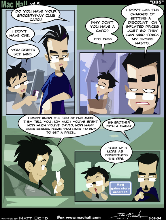 Store clerk: Do you have your Groceryway Club Card? JM: I don't have one. Matt: You don't? Use mine. Matt: Why don't you have a card? It's free. JM: I don't like the charade of getting a discount on inflated prices just so they can keep track of my buying habits. Matt: I don't know, it's kind of fun. See? They tell you how much you've spent, how much you've saved, how many more special items you have to buy to get a prize... JM: Big Brother with a smile? Matt: I think of it more as Foodstuffs the RPG. <<Matt gains store credit +1>>