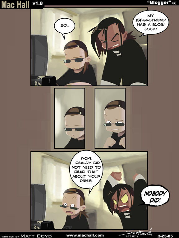 [[Ian is sitting at a computer with an enraged Micah over his shoulder.]] Ian: So... Micah: My ex-girlfriend has a blog! Look! [[Ian observes said blog.]] [[Ian gets a disgusted look on his face.]] Ian: Wow, I really did not need to read that about your penis. Micah: NOBODY DID!