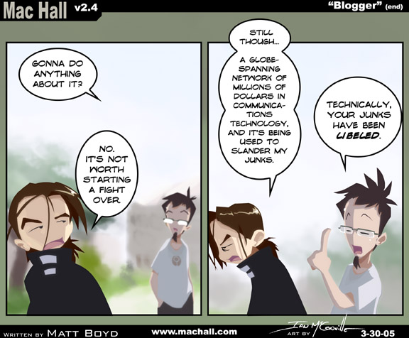 Matt: Gonna do anything about it? Micah: No. It's not worth starting a fight over. Micah: Still though... a globe-spanning network of millions of dollars in communications technology, and it's being used to slander my junks. Matt: Technically, your junks have been libelled.