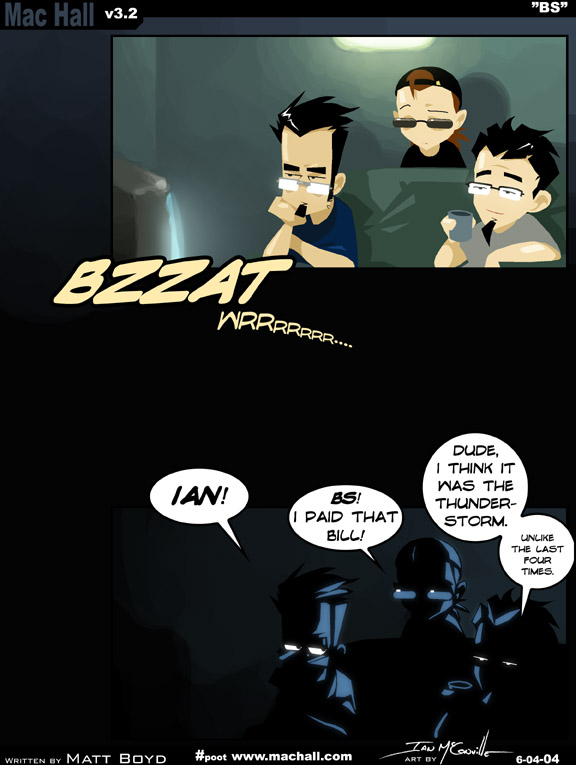 <<BZZAT>> <<WRRRRRRR...>> JM: Ian! Ian: BS! Ian: I paid that bill! Matt: Dude, I think it was the thunderstorm. Matt: Unlike the last four times.