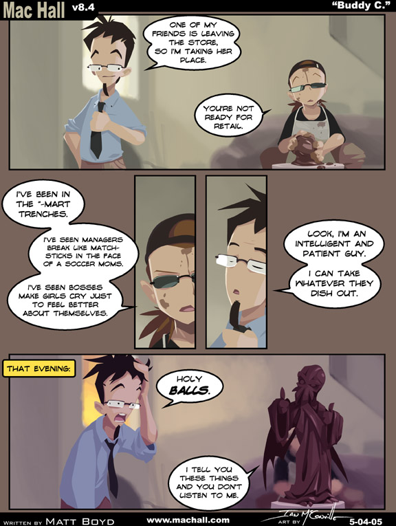 [[Matt is back from work, slouching and with his hand on his head in an expression of disbelief. Ian is sitting on the couch still, but his previous lump of pottery clay has been transformed into a statue of Buddy Cthulhu.]]