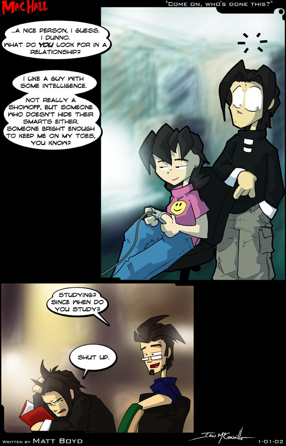 [[Helen sits, holding a game controller while Micah stands behind her, looking stunned and surprised]] Helen: ...a nice person, I guess. I dunno. What do YOU look for in a relationship? I like a guy with some intelligence. Not really a showoff, but someone who doesn't hide their smarts either. Someone bright enough to keep me on my toes, you know? [[JM looks over his shoulder, amused, at Micah, who is holding a book, ruffling his hair and looking disturbed]] JM: Studying? Since when do you study? Micah: Shut up.