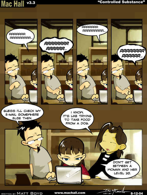 [[Matt is standing next to Helen, who is at her laptop.]] Helen: Rrrrrrrrrrrrrrrr... [[Matt reaches for the mouse.]] Helen: RRRRRRRRRRRRRR... [[Matt moves his hand back.]] Helen: Rrrrrrrrrrrrrrrr... [[Matt reaches for the mouse again.]] Helen: RRRRRRRRRRRRRR... [[Matt stops his attempts and we see Micah on the other side of Helen.]] Matt: Guess I'll check my email somewhere else then. Micah: I know. It's like trying to take food from a dog. Don't get between a woman and her level 20.