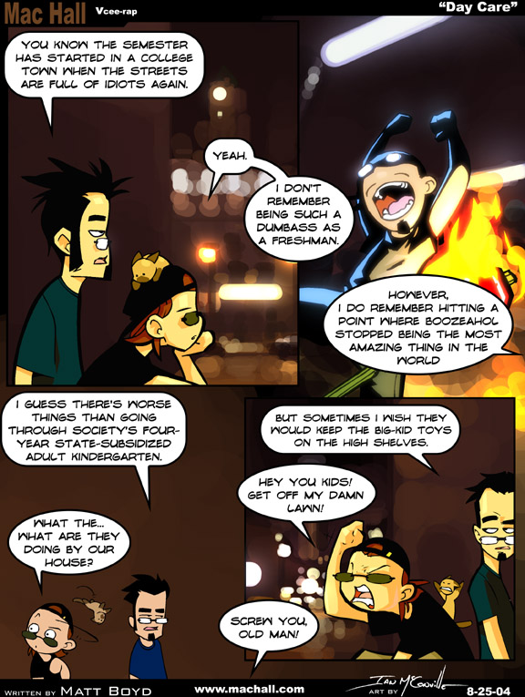 JM: You know the semester has started in a college town when the streets are full of idiots again. Ian: Yeah. I don't remember being such a dumbass as a freshman. [[Male Freshman lights a stop sign on fire.]] Ian: However, I do remember hitting a point where boozeahol stopped being the most amazing thing in the world. JM: I guess there's worse things than going through society's four-year state-subsidized adult kindergarten. Ian: What the... What are they doing by our house? JM: But sometimes I wish they would keep the big-kid toys on the high shelves. Ian: Hey you kids! Get off my damn lawn! [[Off panel]] Male Freshman: Screw you, old man!
