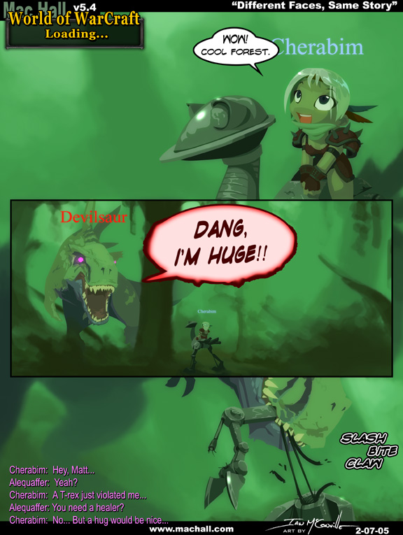 [[A green forest in Ungoro Crater, a Gnome rogue named Cherabim rides on a mecha-strider]] Cherabim: Wow! cool forest. [[A very large dinosaur named Devilsaur comes out of trees, towering over Cherabim]] Devilsaur: DANG, I'M HUGE!! [[Devilsaur proceeds to bite the mecha-strider in half]] <<Slash Bite Claw>> [[In game text appears, no comic]] Cherabim: Hey, Matt... Alequaffer: Yeah? Cherabim: A T-rex just violated me... Alequaffer: You need a healer? Cherabim: No.. but a hug would be nice...