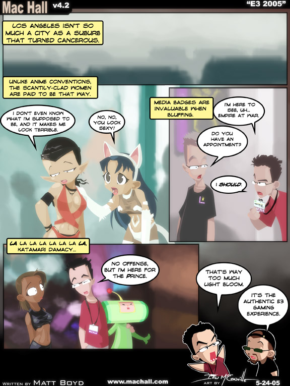 Narration: Unlike anime conventions, the scantily-clad women are paid to be that way.