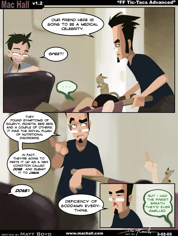 [[Jim is bringing Ian into the living room... in a wheelbarrow.]] Jim: Our friend here is going to be a medical celebrity. Matt: Sweet! Ian: (sickly) ... [[Jim explains the diagnosis; Ian (weakly) gives him the finger, still prone in the wheelbarrow.]] Jum: They found symptoms of scurvy, rickets, beri beri, and a couple of others. It was a royal flush of nutritional disorders. In fact, they're going to write it up as a new condition called DOGE and submit it to JAMA. Matt: DOGE? [[Jim concludes...] Jim: Deficiency of Goddamn Everything. Ian: But I had the finest breath they'd ever smelled.