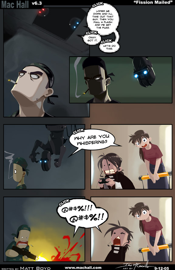 [[The third panel shows Blue-eyed soldier just behind the guard. The guard's eyes are now wide open. The fourth panel shows Micah playing a video game, wearing a headset. Helen is behind him, looking confused. Blue-eyed soldier and Helen share a speech bubble. The panels are presented side-by-side.]