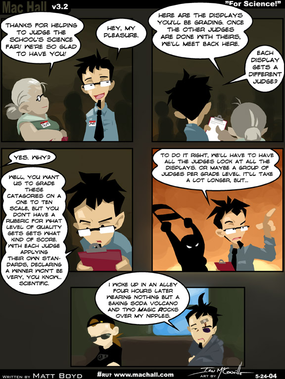 Matt: Well, you want us to grade these categories on a one to ten scale, but you don't have a ruberic for what level of quality gets what kind of score. With each judge applying their own standards, declaring a winner won't be very, you know... scientific.