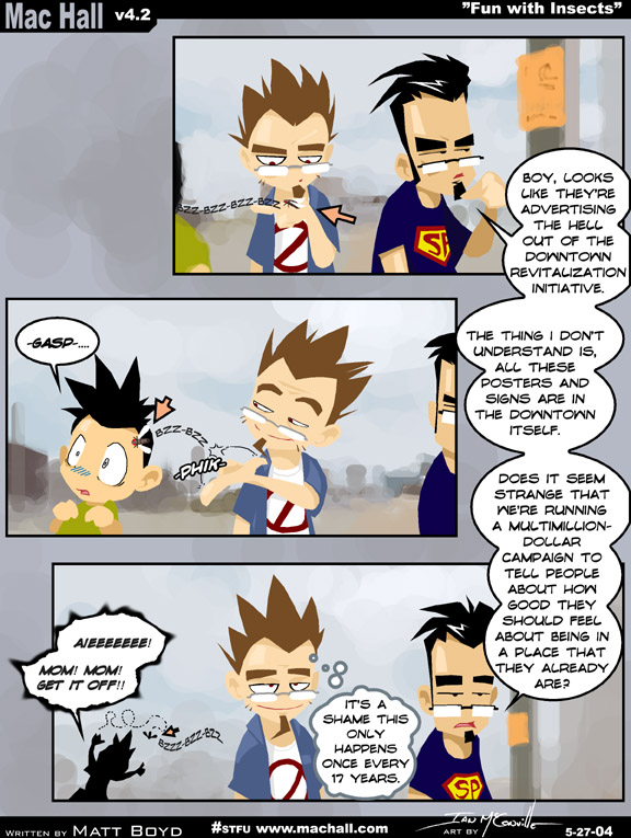 [[A cicada has landed on Drew's hand]] <<Bzz-Bzz-Bzz-Bzz>> JM: Boy, looks like they're advertising the hell out of the downtown revitalization initiative. [[Drew flicks the cicada onto a kid]] <<-Phik->> <<Bzz-Bzz>> Kid: -GASP-... JM: The thing I don't understand is, all these posters and signs are in the downtown itself. Kid: AIEEEEEEE! MOM! MOM! GET IT OFF!! <Bzz-Bzz-Bzz>> Drew: (Thinking) It's a shame this only happens once every 17 years. JM: Does it seem strange that we're running a multimillion-dollar campaign to tell people about how good they should feel about being in a place they already are?