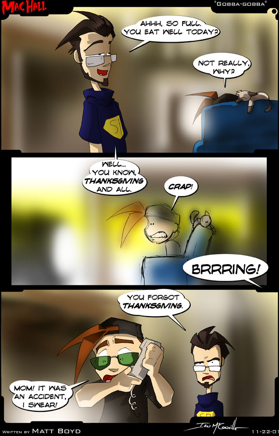 [[JM is standing, Ian is sitting in a comfy chair, resting]] JM: Ahhh, so full. You eat well today? Ian: Not really, why? JM: Well???you know, THANKSGIVING and all. Ian: CRAP! <<BRRRING!>> [[JM looks disgusted, Ian looks frantic]] JM: You forgot THANKSGIVING. Ian: Mom! It was an accident, I swear!