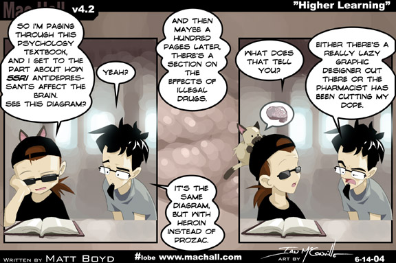 [[Ian is at the table, reading a book; Matt sits beside him]] Ian: So I'm paging through this psychology textbook, and I get to the part about how SSRI antidepressants affect the brain. Ian: See this diagram? Matt: Yeah? Ian: And then maybe a hundred pages later, there's a section on the effects of illegal drugs. Matt: It's the same diagram, but with heroin instead of prozac. Ian: What does that tell you? Matt: Either there's a really lazy graphic designer out there or the pharmacist has been cutting my dope. [[Ian's cat shows a speech bubble with a brain in it]]