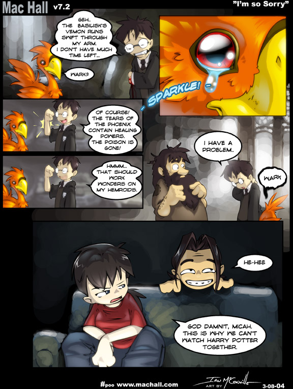 [[Harry Potter and the Chamber of Secrets movie is on.]] Harry: Geh.. the basilisk's venom runs swift through my arm. I don't have much time left... Fawkes: Wark? <<SPARKLE!>> Harry: Of course! The tears of a phoenix contain healing powers. The poison is gone! Harry: Hmmm... that should work wonders on my hemroids. [[Harry is talking to Hagrid. The butt end of Fawkes is sticking out of his butt end.]] Harry: I have a problem.. Fawkes: WaRk [[Helen is sitting on the couch, Micah standing behind the couch.]] Helen: God damnit, Micah. This is why we can't watch Harry Potter together. Micah: He-hee