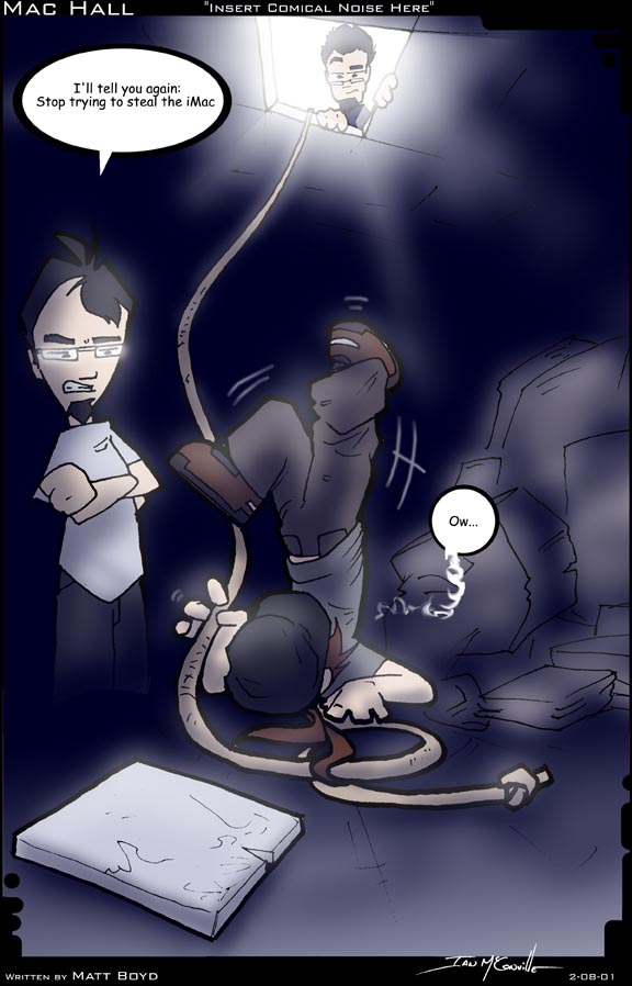 [[In the darkened Integic storage room, Ian is faceplanted into the