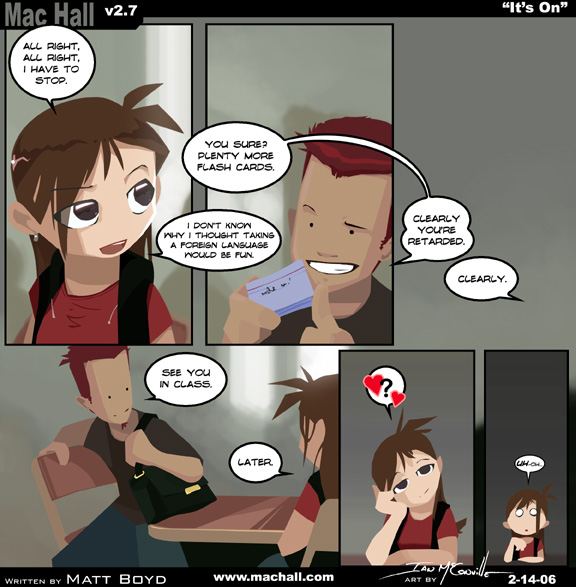 [[Helen and Some Guy are studying with flash cards.]] Helen: All right, all right, I have to stop. Some Guy: You sure? Plenty more flash cards. Helen: I don't know why I thought taking a foreign language would be fun. Some Guy: Clearly you're retarded. Helen: Clearly. [[Some Guy gets up from desk.]] Some Guy: See you in class. Helen: Later. [[Helen wonders is she has a crush on him. Hearts appear with a question mark.]] Helen: Uh-oh.