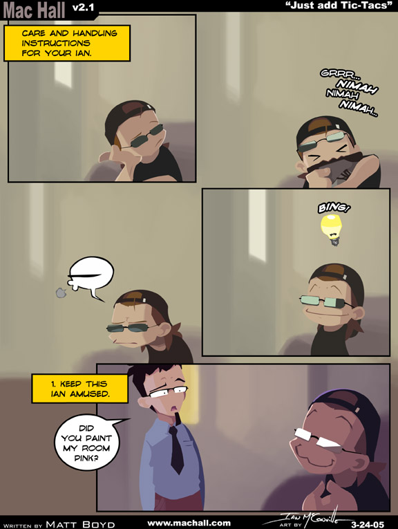 [[Ian is shown sitting on a couch looking bored. In a yellow box reads this text]] Care and handling instructions for your Ian. [[Ian looks to be chewing on his own shoe...]] Ian: Grrr... Nimah nimah nimah... [[Ian expresses an exhausted and bored emoticon.]] [[Ian has an idea, indicated by a light bulb appearing over his head.]] <<Bing!>> [[In a yellow box reads this text]] 1. Keep this Ian amused. Matt: Did you paint my room pink?