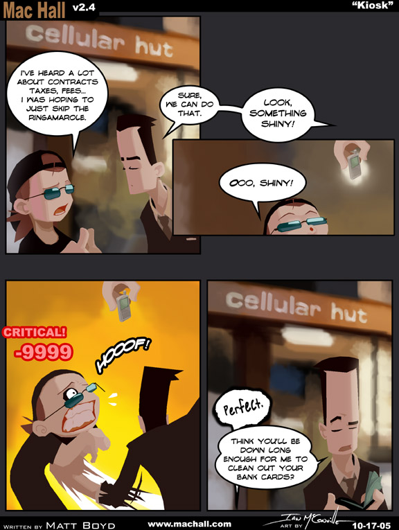 [[At the Cellular Hut Ian talks to a salesman.] Ian: I've heard a lot about contracts taxes, fees... I was hoping to just skip the whole rigamarole. Salesman: Sure, we can do that. [[Salesman holds out a cell phone.]] Salesman: Look, something shiny! Ian: Ooo, shiny! [[Salesman punches Ian in the gut.]] Ian: <<HOOOF!>> Damage: Critical! -9999 [[Ian is off the panel, presumably curled up on the ground. The Salesman is looking through Ian's wallet.]] Ian: Perfect. Salesman: Think you'll be down long enough for me to clean out your bank cards?