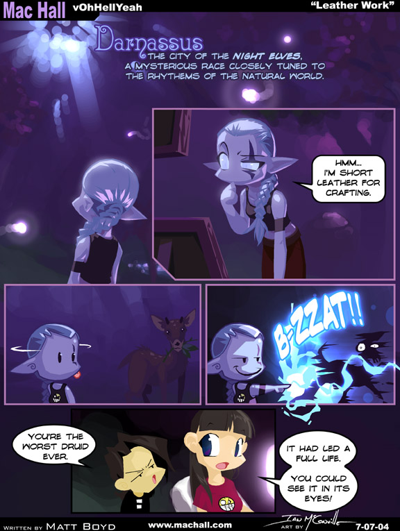 [[low-level Nigh Elf druid stands in Darnassus, a city in the video game World of Warcraft]] Druid:"Hmm... I'm short leather for crafting" [[lone deer walks by, she looks at him with interest]] [[Druid zaps deer]] <> [[out of WoW sequence]] Michah:"You're the worst druid ever" Helen: "It had led a full life. You could see it in its eyes!"