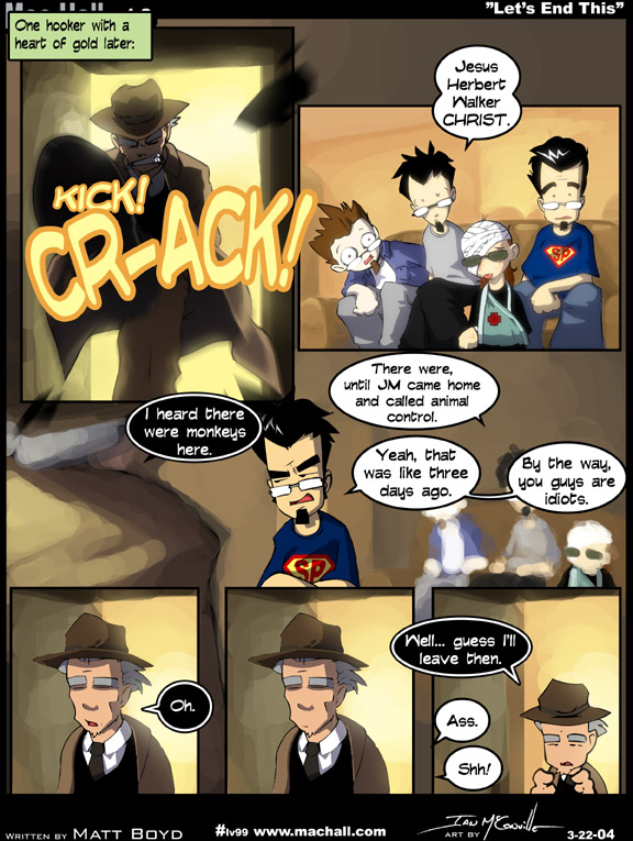 [[One hooker with a heart of gold later: McGillicutty knocks down the door to a stunned Drew, Matt, bandaged Ian, and JM.]] <> Matt: Jesus Herbert Walker CHRIST. McGillicutty: I heard there were monkeys here. Matt: There were, until JM came home and called animal control. JM: Yeah, that was like three days ago. By the way, you guys are idiots. McGillicutty: Oh. McGillicutty: Well... guess I'll leave then. Guys: Ass. Guys: Shh!