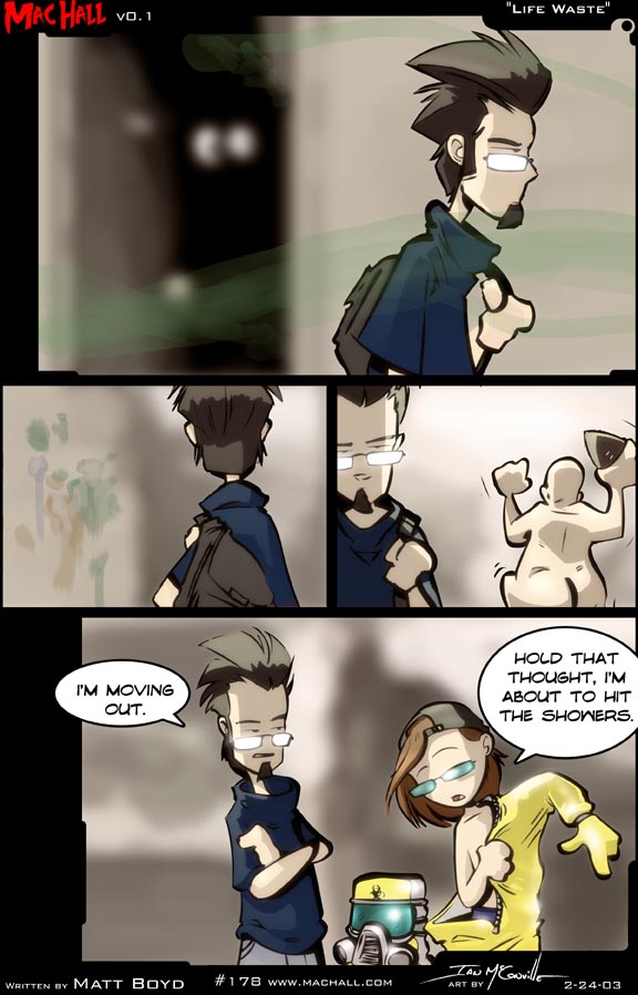 [[JM walking through a hallway, oder wafting around him]] [[Naked football enthusiast/jock running naked]] [[Ian climbing into a hazard suit]] JM: I'm moving out. Ian: Hold that thought, I'm about to hit the showers.