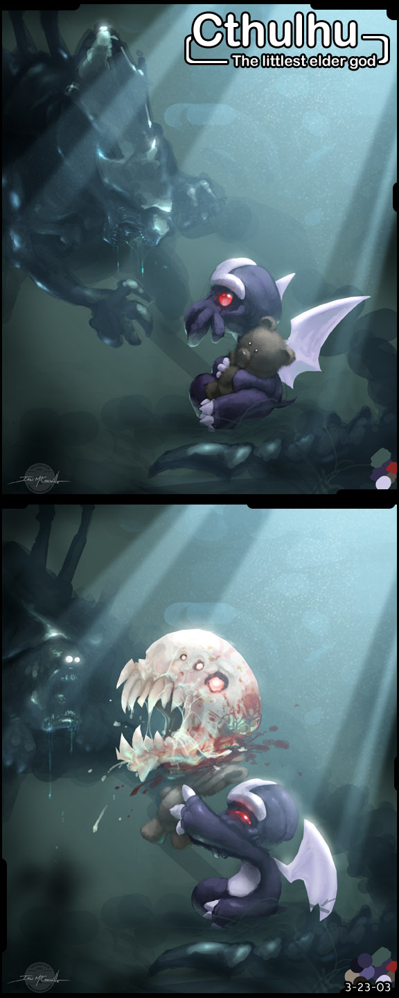 [[Cthulhu The littlest elder god. Cthulhu is shown sitting down and hugging a teddy bear as he looks up at a large, drooling alien monster.]]