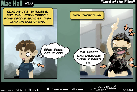 Narrator: Cicadas are harmless but they still terrify some people because they land on everything [[College girl has one cicada on her shoulder]] College girl: EEEE! EEEEE! GET IT OFF! Narrator: Then there's Ian. [[Ian covered in cicadas]] Ian: The Insect King demands your pumpkin pie!