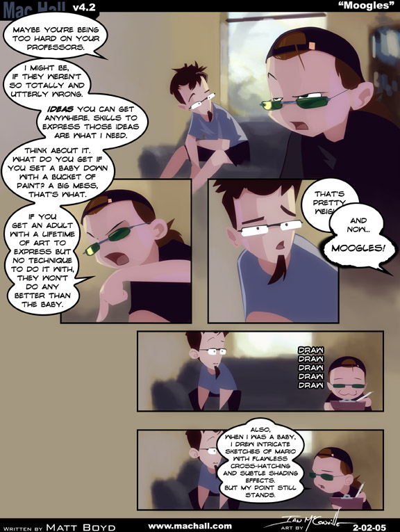 Ian: I might be if they weren't so totally and utterly wrong. Ideas you can get anywhere. Skills to express those ideas are what I need. Think about it. What do you get if you set a baby down with a bucket of paint? A big mess, that's what. If you get an adult with a lifetime of art to express but no technique to do it with, they won't do any better than a baby.