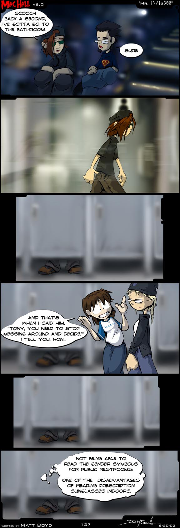 Ian: Not being able to read the gender symbols for public restrooms: one of the disadvantages of wearing prescription sunglasses indoors.