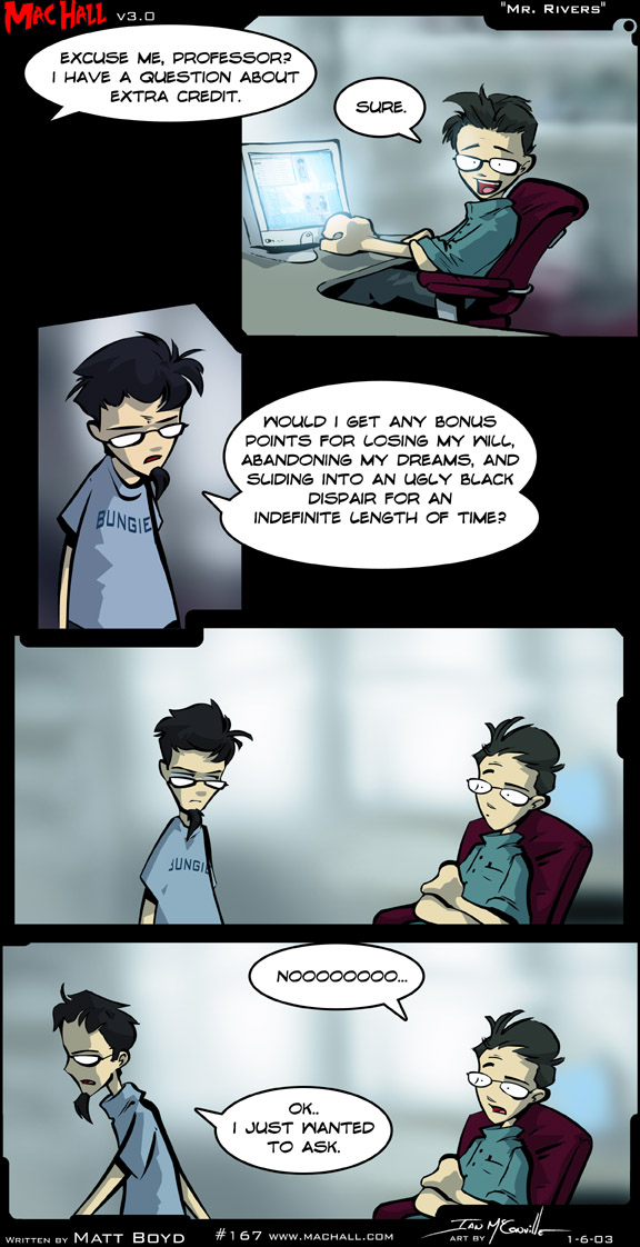 Matt: Would I get any bonus points for losing my will, abandoning my dreams, and sliding into an ugly black despair for an indefinite length of time?
