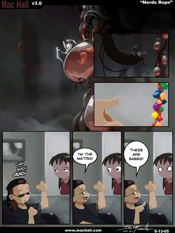 [[The real world from the movie The Matrix is shown. A robot arm is about to pick one of the many capsules that contain humans in pinkish fluid.]] [[Ian's fingers can now be seen, mimicking the robot arm in the action of picking a single nerd candy from a Nerds Rope.]] [[Helen is looking at Ian eating his Nerds Rope.]] Ian: <<Chew munch crunch>> Ian: I'm the Matrix! [[Ian points to the Nerds Rope, Helen's eyes widen.]] Ian: These are babies!