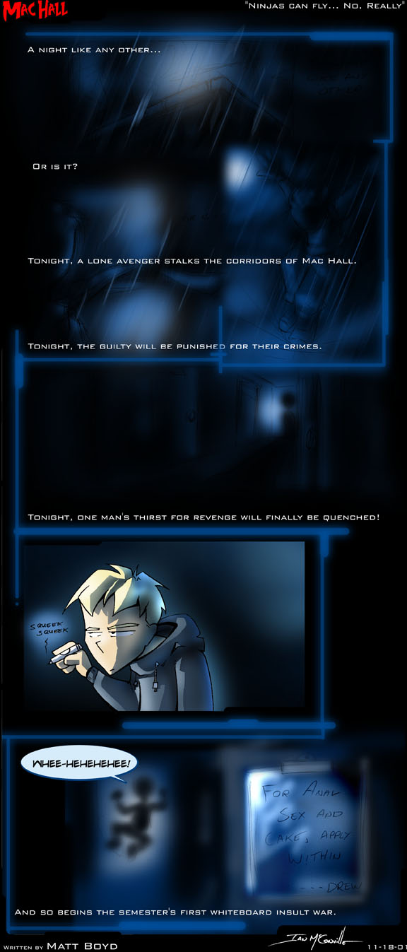 Narrator: Tonight, a lone avenger stalks the corridors of Mac Hall.