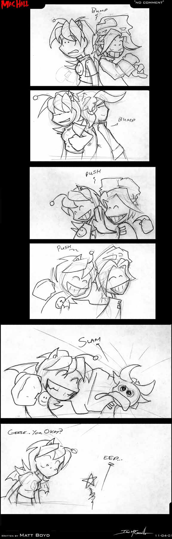 [[Helen and Micah bump shoulder blades]] <<Bump>> [[Helen smiles and elbows smiling Micah in the back]] <<Bump>> [[Micah grins and pushes grinning Helen]] <<Push>> [[Helen grins and pushes grinning Micah in the back]] <<Push>> [[Helen punches Micah too hard, Micah falls over, in surprise]] <<SLAM>> [[Helen looks down at dazed Micah]] Helen: Geese..You okay? Micah: EEP...