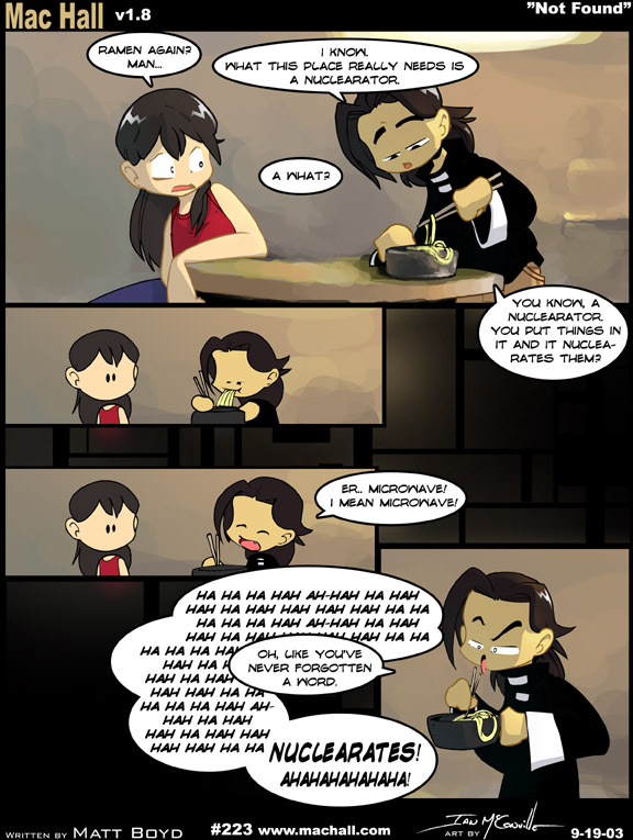 Helen: Ramen again? Man... Micah: I know. What this place really needs is a nuclearator. Helen: A what? Micah: You know, a nuclearator. You put things in it and it nuclearates them? Micah: Er.. microwave! I mean microwave! Helen: HA HA HA HAH AH-HAH HA HAH HAH HA HAH HAH HAH HAH HA HA HA HA HA HAH AH-HAH HA HAH... Micah: Oh, like you've never forgotten a word. Helen: NUCLEARATES! AHAHAHAHAHAHA!
