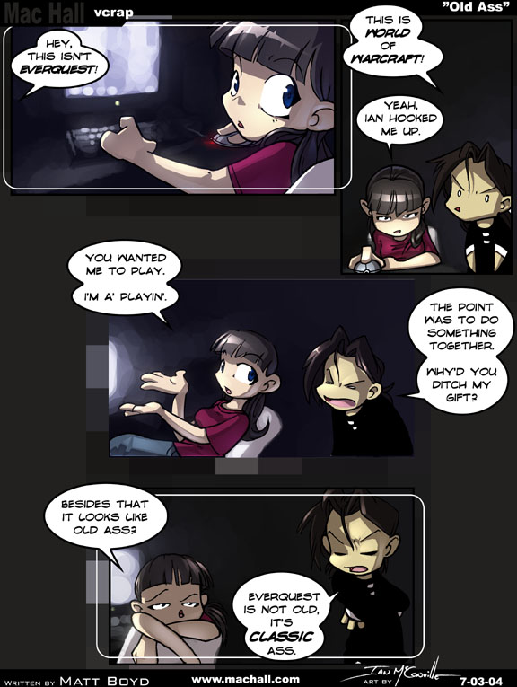 [[Helen, behind her computer, looks around]] Micah: Hey, this isn't Everquest! Micah: This is World of Warcraft! Helen: Yeah, Ian hooked me up. Helen: You wanted me to play. Helen: I'm a' playin'. Micah: The point was to do something together. Micah: Why'd you change my gift? Helen: Besides that it looks like old ass? Micah: Everquest is not old, it's classic ass.