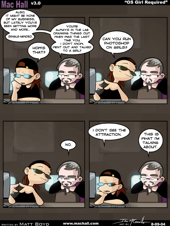 Professor: Also, it might be none of my business, but lately you've been getting more and more... single-minded. Ian: How's that? Professor: You're always in the lab cranking things out. When was the last time you, I don't know, went out and talked to a girl? Ian: Can you run photoshop on girls? Professor: No. Ian: I don't see the attraction. Professor: This is what I'm talking about.