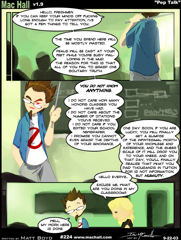 Drew: Hello, freshmen. If you can keep your minds off fucking long enough to pay attention, I've got a few things to tell you. The time you spend here will be mostly wasted. Peals will be cast at your feet while you're busy wallowing in the mud. The reason for this is that all of you fail to grasp one solitary truth:
