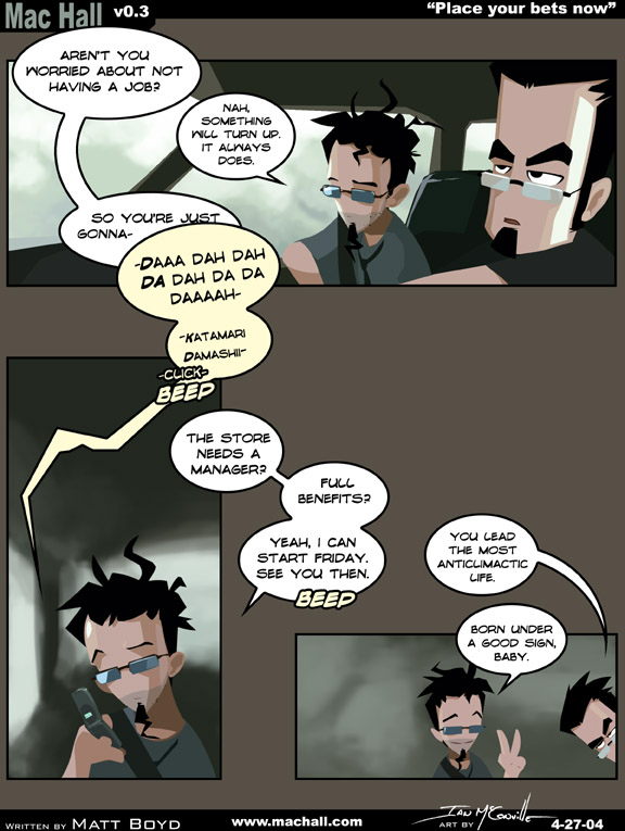 [[JM and Matt are in a car, JM driving. Matt looks a bit haggard, as he is unshaven and his hair is all over the place.]] JM: Aren't you worried about not having a job? Matt: Nah, something will turn up. It always does. JM: So you're just gonna- <<Daaa dah dah DA dah da da daaah Katamari Damashii>> <<Click>> <<BEEP>> [[Matt is talking on his cell phone.]] Matt:The store needs a manager? Full benefits? Yeah, I can start Friday. See you then. <<BEEP>> JM: You lead the most anticlimactic life. Matt: Born under a good sign, baby.