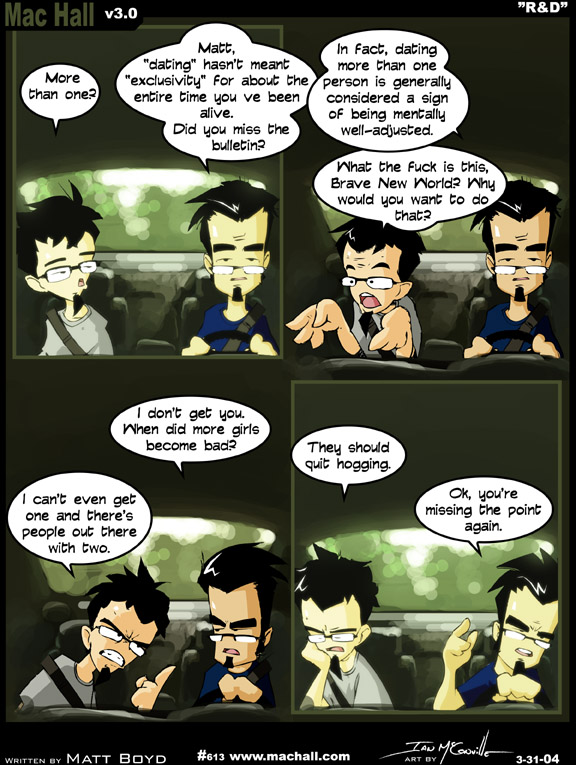 [[JM and Matt are in a car with JM driving.]] Matt: More than one? JM: Matt, "dating" hasn't meant "exclusivity" for about the entire time you've been alive. JM: Did you miss the bulletin? JM: In fact, dating more than one person is generally considered a sign of being mentally well-adjusted. Matt: What the fuck is this, Brave New World? Matt: Why would you want to do that? JM: I don't get you. JM: When did more girls become bad? Matt: I can't even get one and there are people out there with two. Matt: They should quit hogging. JM: OK, you're missing the point again.