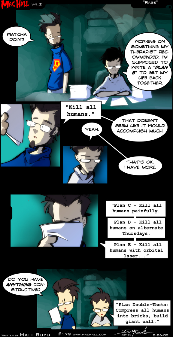 alternate thursdays. Plan E- kill all humans with orbital laser..."