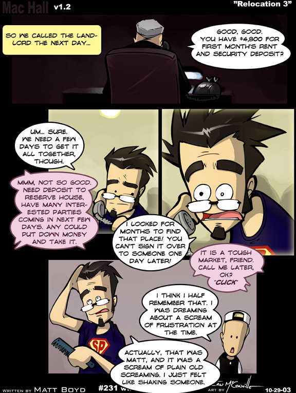 [[JM's landlord sits at his desk on the phone, turned away from the viewer.]]