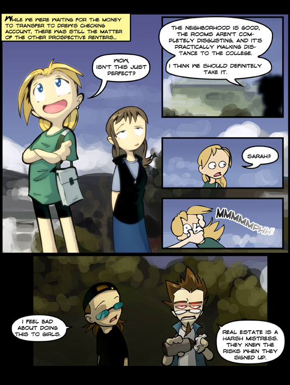 [[Two girls are looking at the house.]] JM narrating: While we were waiting for the money to transfer to Drew's checking account, there was still the matter of the other prospective renters... Prospective renter 1: The neighborhood is good, the rooms aren't completely disgusting, and it's practically walking distance to the college. I think we should definitely take it. Wow, isn't this just perfect? Sarah? MMMMMPHH! [[Ian and Drew are hiding in the bushes, Drew is holding a bottle of chloroform and a napkin.]] Ian: I feel bad about doing this to girls. Drew: Real estate is a harsh mistress. They knew the risks when they signed up.