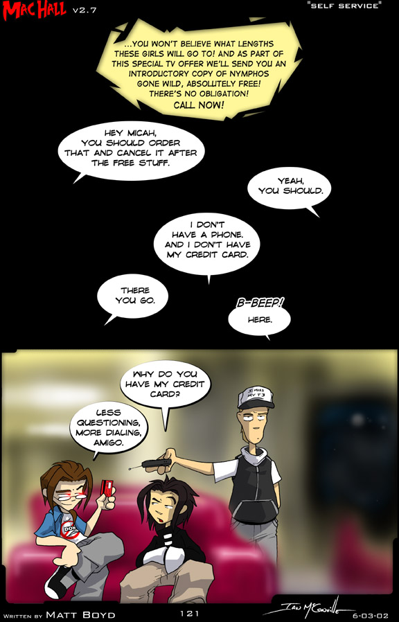 [[Drew sits on the couch next to Micah, holding a credit card; Alan