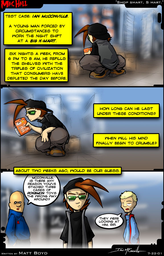 [[Ian crouches next to a cardboard box pulling orange toy packages from it and using them to restock a retail rack]]