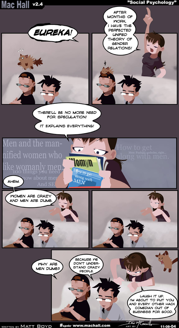 Helen: EUREKA! [[The cat on Ian's head jumps in surprise]] Helen: After months of work, I have perfected unified theory of gender relations! Helen: There'll be no more need for speculation! It explains everything! [[Helen is holding a stack of booklets/pamphlets, among which are "Womyn" and "How to get along with MEN"]] Helen: Ahem. Women are crazy and men are dumb. [[Ian and Matt look at each other]] Ian: Why are men dumb? Matt: Because we don't understand crazy people. Helen: Laugh it up. I'm about to put you and every other hack comedian out of business for good. [[The cat is pouncing on Helen]]