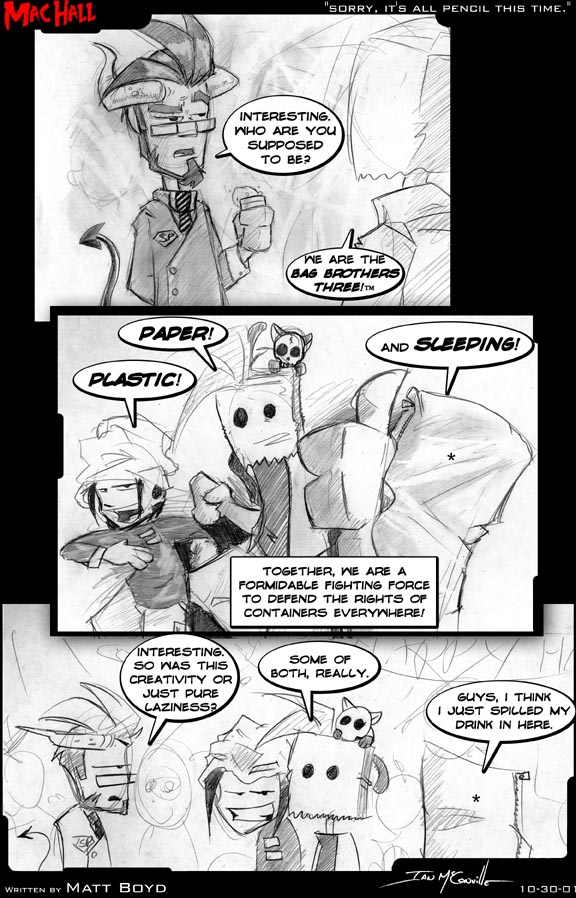 [[Micah, Ian and Matt stand, Micah wearing a plastic bag on his head, Ian a paper, and JM a sleeping bag]]