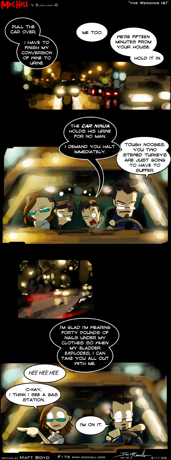 Anthony: The car ninja holds his urine for no man. I demand you halt