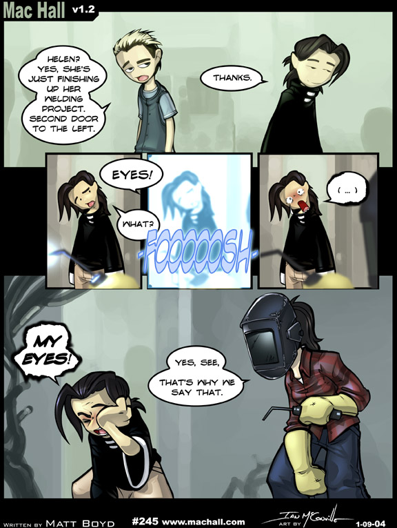 [[Random guy and Micah are walking past eachother.]] Random guy: Helen? Yes, she's just finishing up her welding project. Second door to the left. Micah: Thanks. [[Micah's walks in the door. Helen's welding torch can be seen in the foreground.]] Helen: EYES! Micah: What? [[A bright blue light covers the panel.]] <<-FOOOOSH->> [[Same as the second panel, except Micah's face around his eyes is red, and his mouth is open.]] Micah: (...) [[Micah rubs his eye with his hand. Helen is dressed in a welding mask and welding gloves, and is holding a welding torch.]] Micah: MY EYES! Helen: Yes, see, that's why we say that.